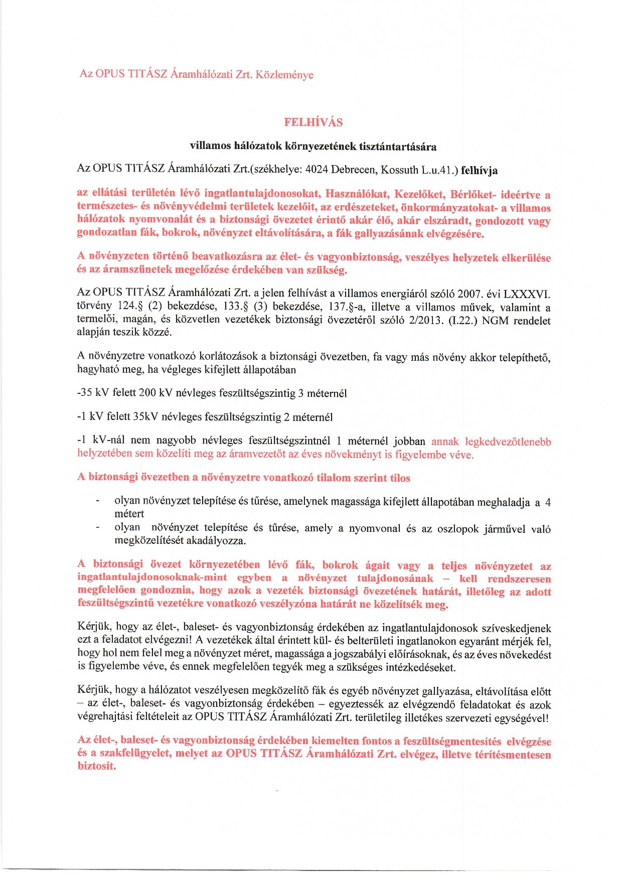 Amennyiben az ingatlan tulajdonosa (kezelője) a felhívás átvételtől számított 15 munkanapon belül nem jelenti be a régióközpontnál, hogy a gallyazást elvégzi, a 16. munkanaptól kezdődően az OPUS TITÁSZ-nál szerződéses jogviszonyban álló vállalkozó jogosult és köteles a növényzet eltávolítását és gallyazását a jogszabályok és a szabvány előírásai szerint elvégezni.