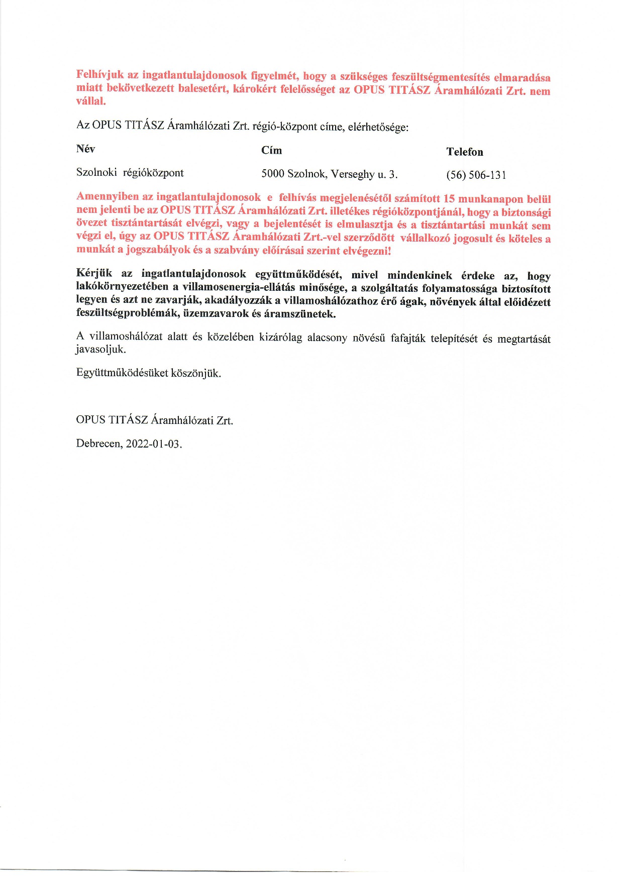 Kérjük az ingatlantulajdonosok együttműködését, mivel mindenkinek érdeke az, hogy lakókörnyezetében a villamosenergia-ellátás minősége, a szolgáltatás folyamatossága biztosított legyen!